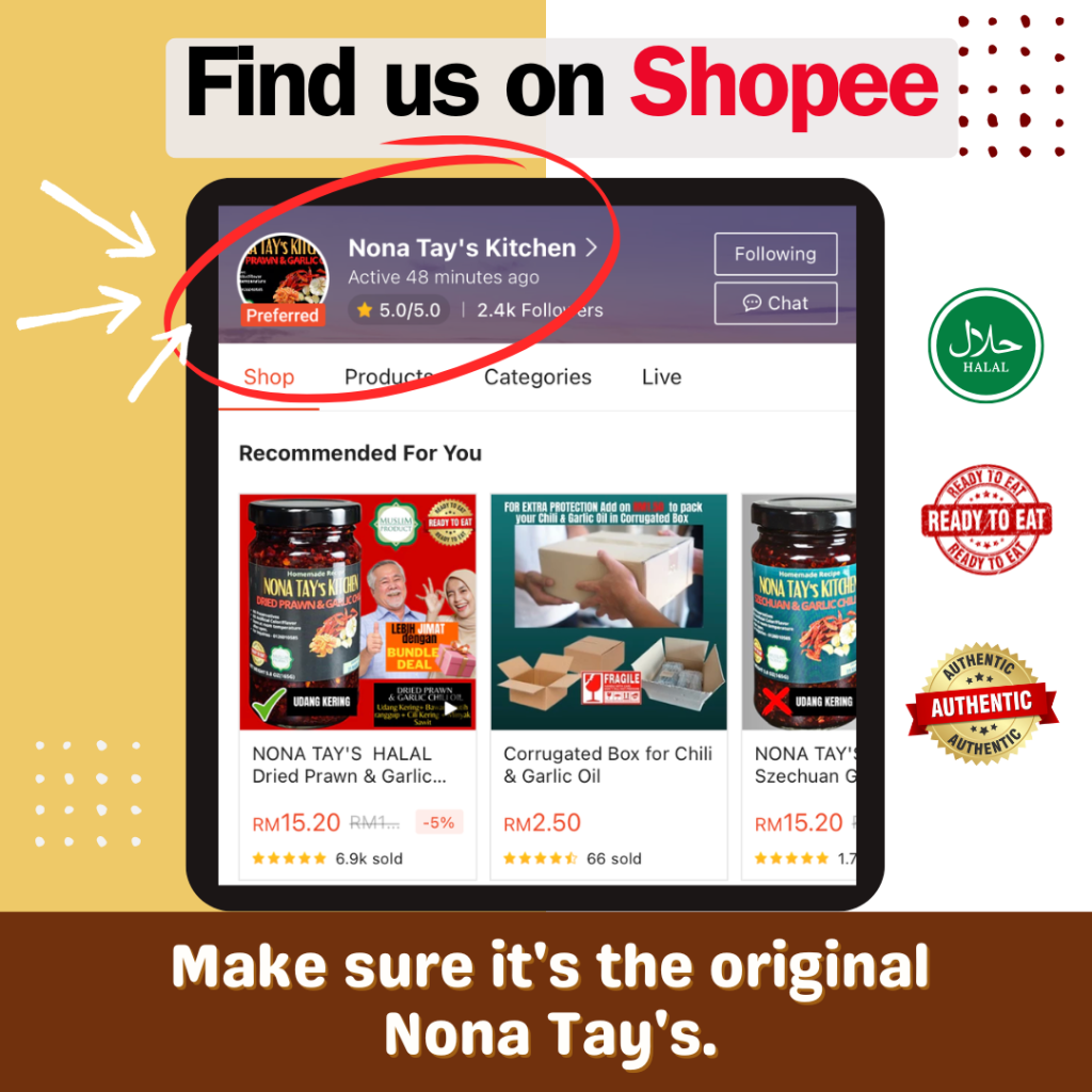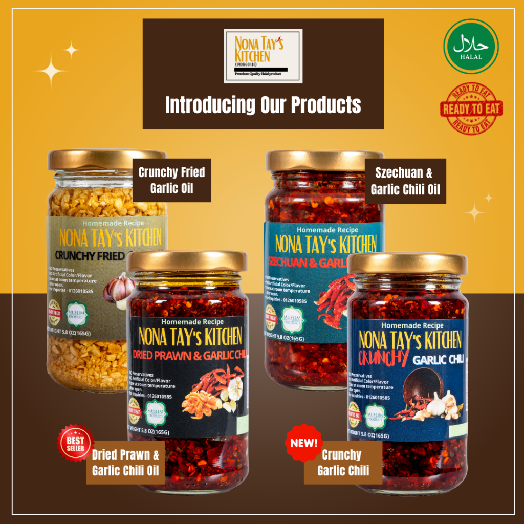 Every bottle of Nona Tay’s Kitchen chili oil is crafted with premium ingredients, made in small batches, and monitored personally by Puan Zarina to ensure the highest quality and consistency.